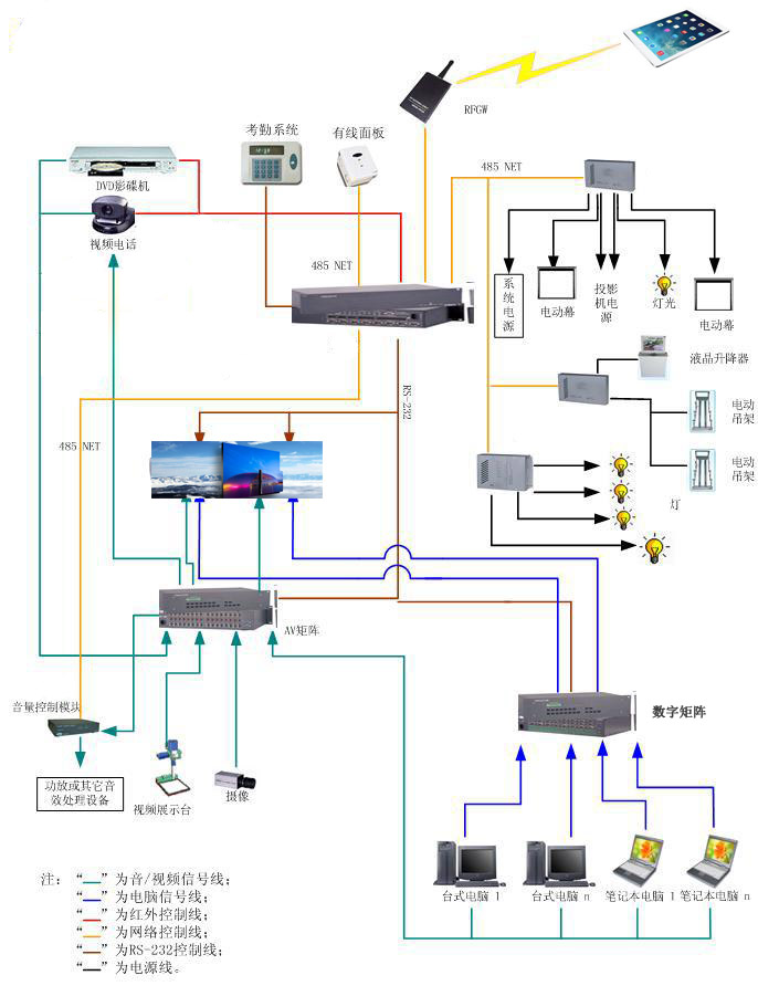 通過(guò)中控配合燈光控制器可對(duì)現(xiàn)場(chǎng)的燈光進(jìn)行控制,音量控制,電源控制等。