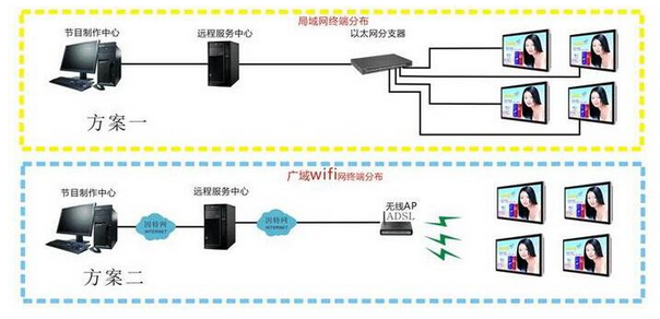 本系統建設是按照由網絡廣告機由播放管理中心、網絡平臺、播放設備、顯示終端四部分組成。