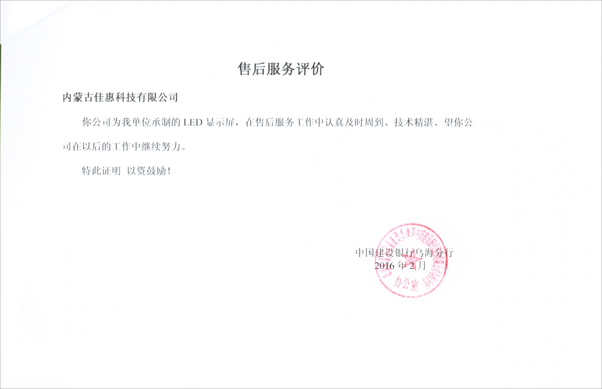 下一條中國建設銀行內蒙古分行包頭優質服務證書