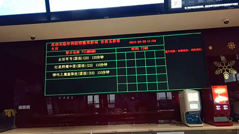 某影城的LED屏可以任意點(diǎn)陣顯示多語(yǔ)種字體,靈活地以多種方式進(jìn)入和退出顯示,可以顯示各種表格,表內(nèi)數(shù)據(jù)可通過(guò)專用的軟件人工輸入和更改,也可以利用編輯軟件將文字、圖片、表格進(jìn)行組合,迭加顯示。可采集計(jì)算機(jī)內(nèi)的當(dāng)前時(shí)間,并適時(shí)分幅顯示,月、日、星期、時(shí)、分、秒等。