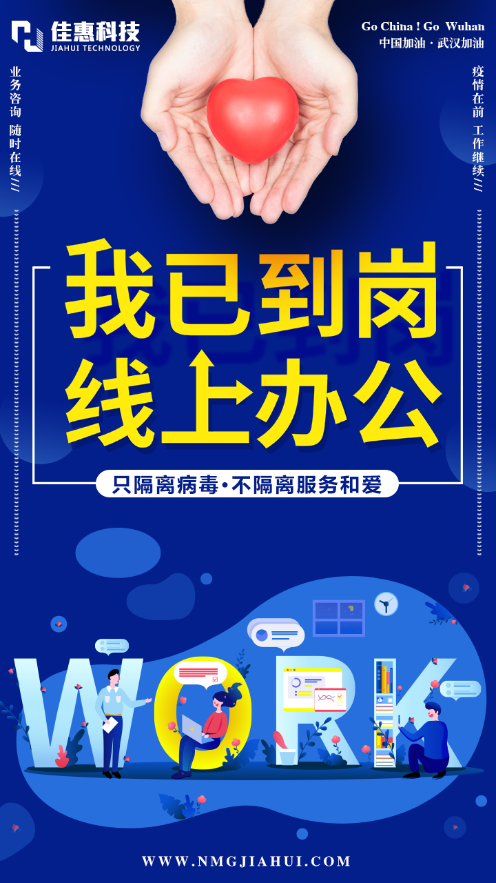 面對疫情防控的嚴峻形勢,內蒙古佳惠科技有限公司積極響應政府疫情防護的號召,有效減少人員聚集,阻斷疫情傳播,在充分保障服務人員安全的前提下,做好疫情防控期間的公司服務工作。這場來勢洶洶的病毒阻擋不了我公司人員的使命,對客戶的服務和關愛,我們從未放松和懈怠。為感謝廣大客戶對我公司一路以來的信任和支持,公司全面啟動線上辦公服務,及時在線響應和解決客戶需求: